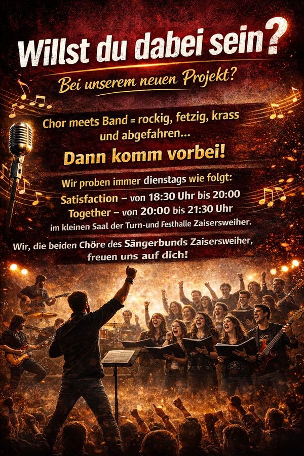 Bei allen Chorgruppen ist ein unverbindliches Reinschnuppern und Mitsingen möglich und gewollt. Am Besten vorher bei den entsprechenden Kontaktpersonen melden. Die Erwachsenen-Chören werden von Michael Wilhelm geleitet. Infos gibt es auch auf unserer Homepage: https://saengerbund-zaisersweiher.de